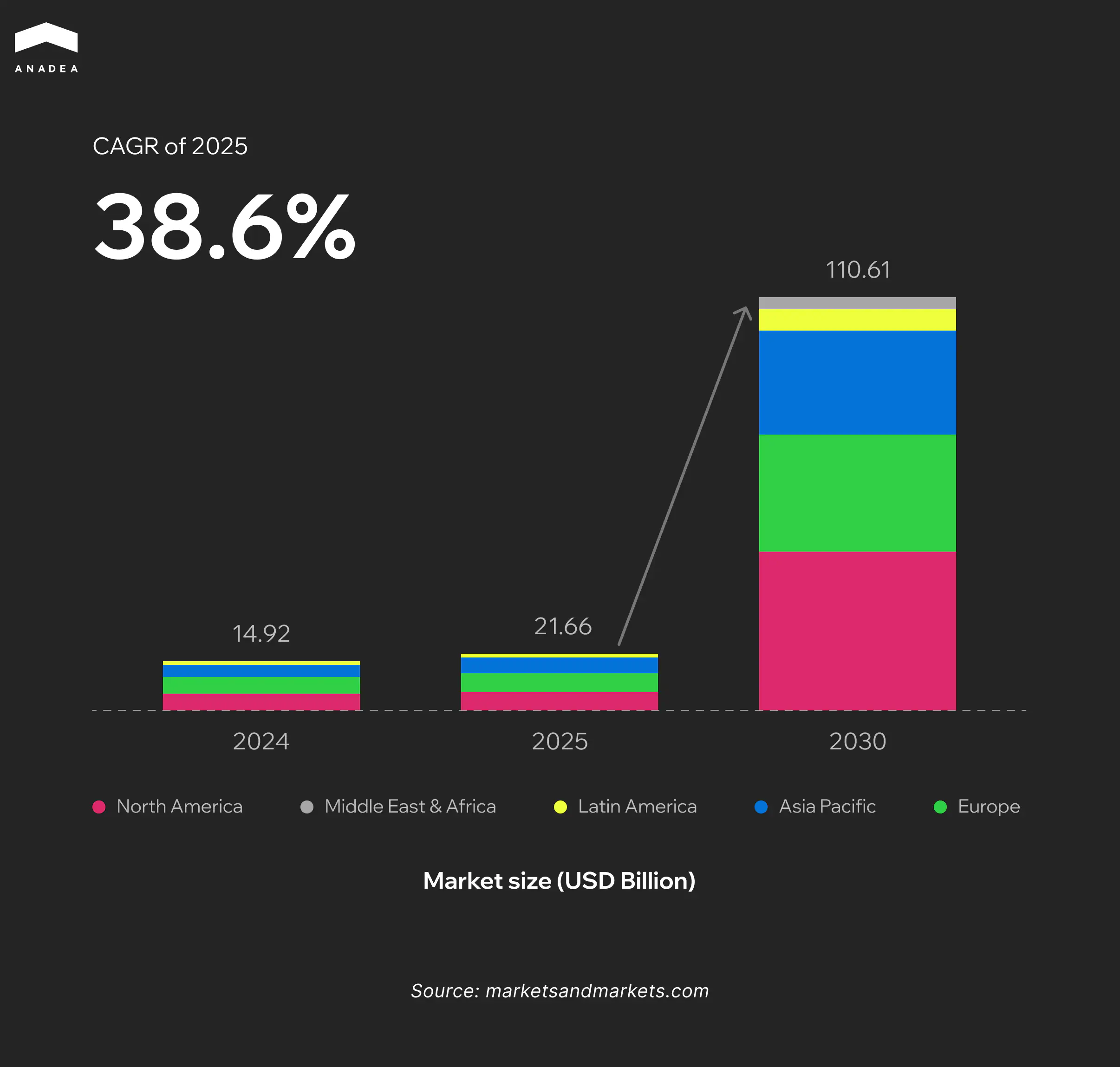 According to the study published by PwC, the AI-related segment of the global healthcare market currently accounts for less than 15%. Nevertheless, by 2030, its share is expected to double. At the same time, Markets and Markets reports that the global AI in healthcare market stood at $14.92 billion in 2024. Experts predicted that by 2030, it will be valued at $110.61 billion, which reflects a CAGR of over 38% for the period from 2025 to 2030.
