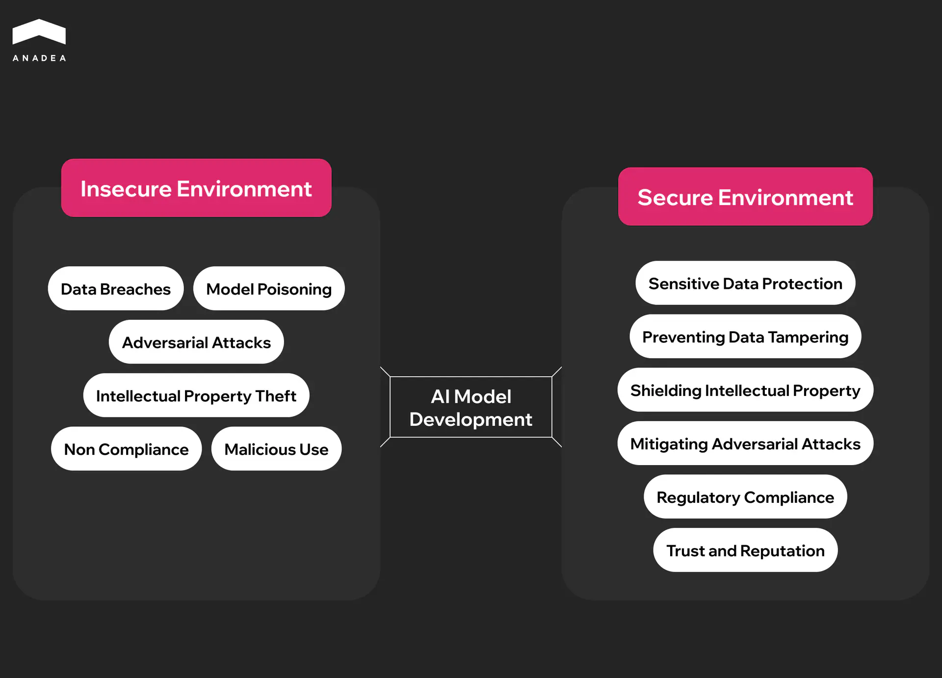 At Anadea, we have been working in custom AI software development for more than 6 years, and the security of AI applications has always been among the top priorities for us. We fully realize all the negative results that can be a consequence of a weak model, data, infrastructure, or access protection.