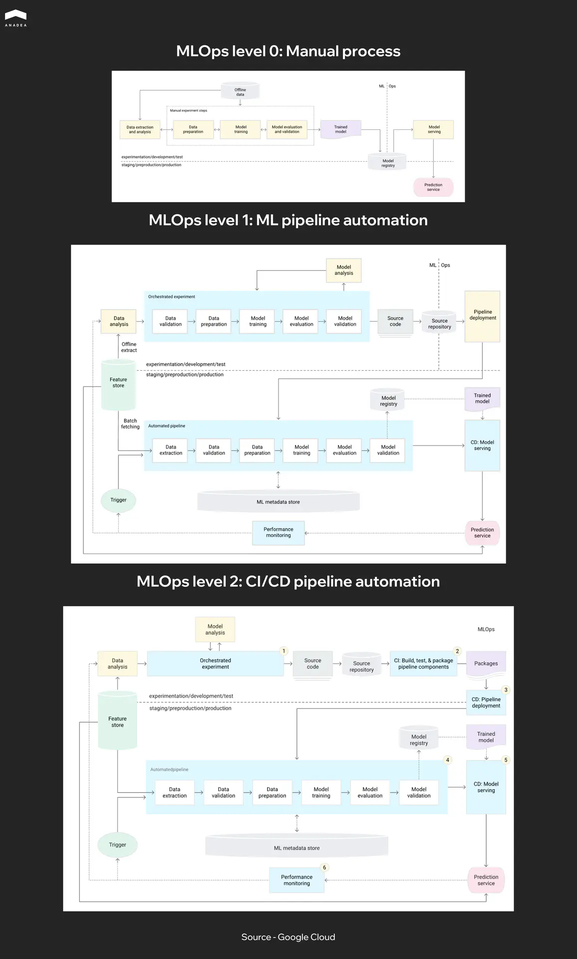 Google describes three MLOps maturity levels in their MLOps framework. Level 0 is a fully manual process where training, evaluation, and deployment all happen by hand. Level 1 automates training but deploying a new model still requires manual approval. Level 2 automates the entire cycle from data to production. Most teams today sit somewhere between Level 0 and Level 1 when it comes to CI/CD for machine learning. If you’re just getting started, the first practical step is adopting a model registry and automating model validation in the CI/CD pipeline. The rest can be added incrementally.