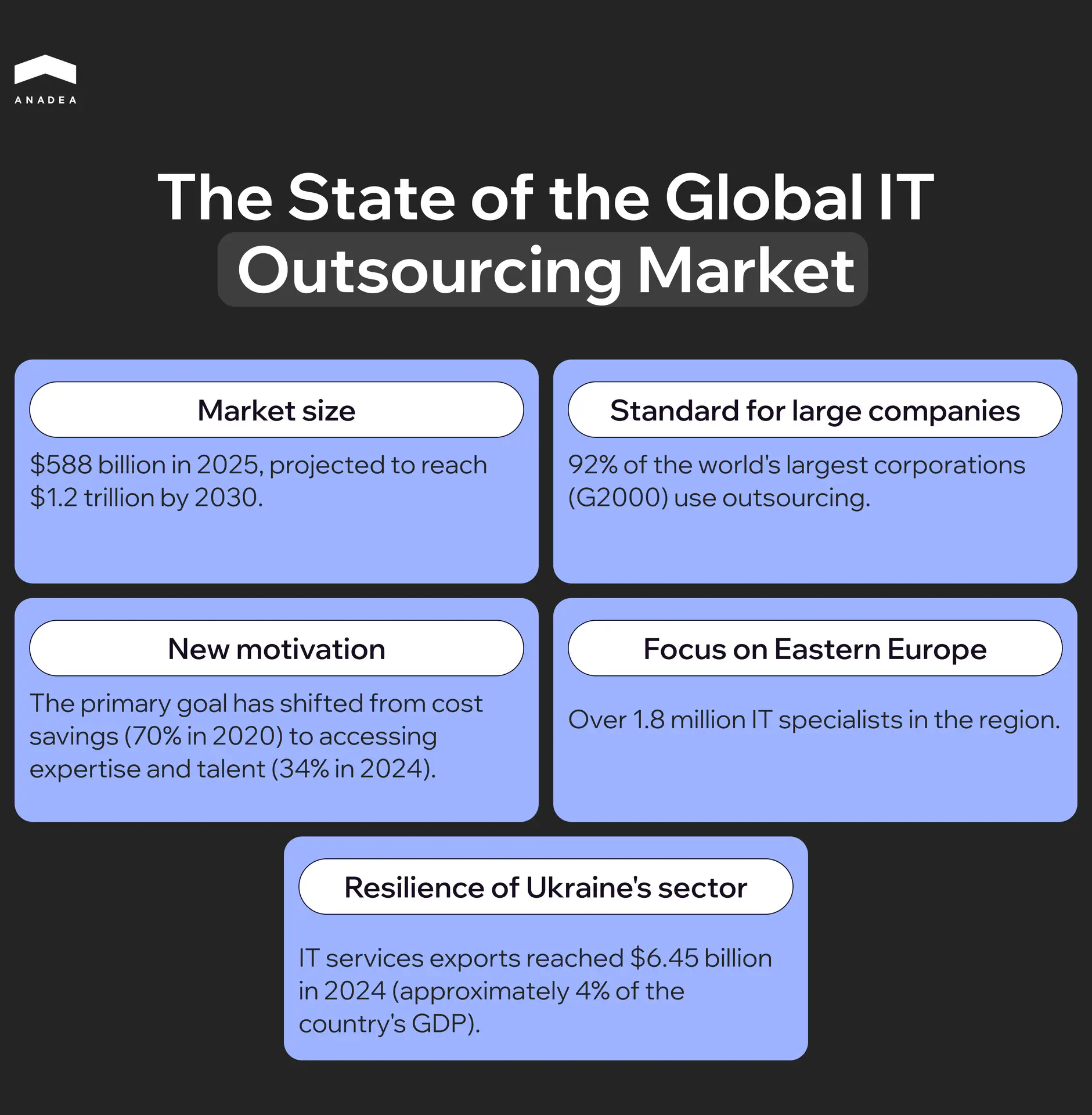 What is interesting is that company motivations are shifting. In 2020, 70% of organizations cited cost reduction as the main reason for outsourcing. By 2024, that figure had dropped to 34%. Instead, access to talent and specialized expertise is becoming more important, particularly in AI, cybersecurity, and cloud technologies.