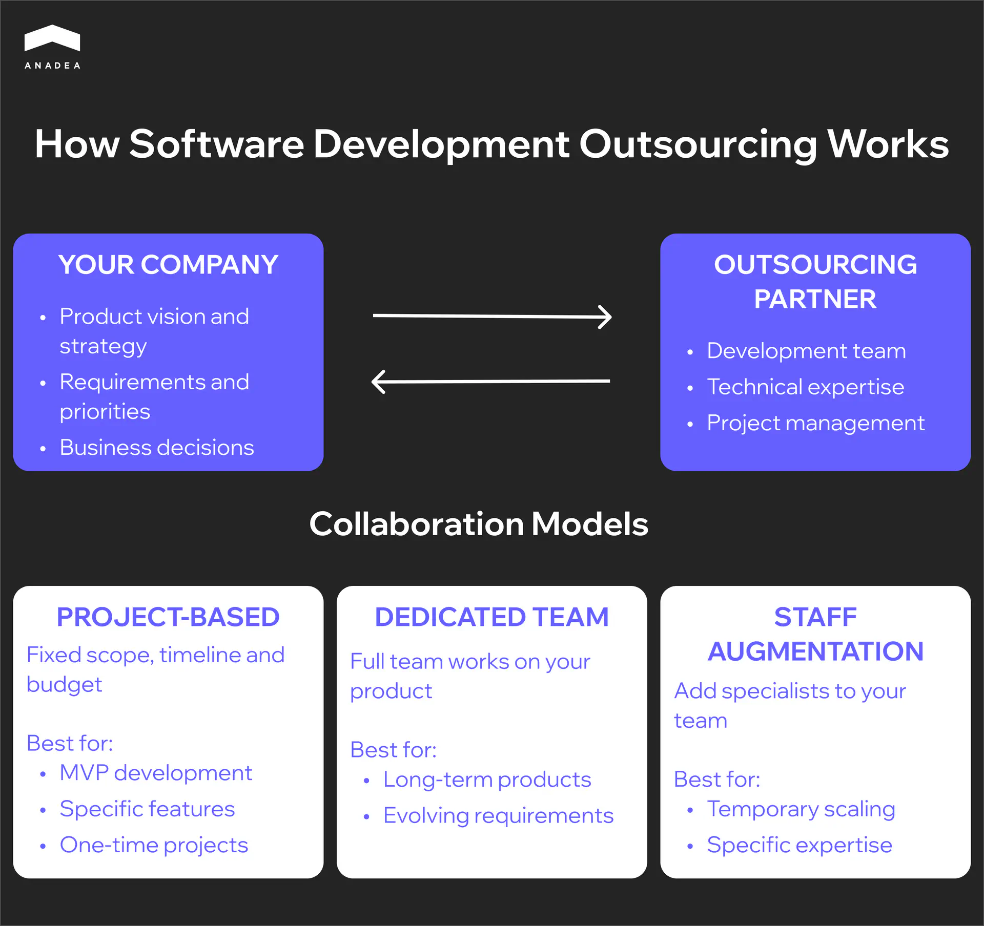 In practice, it looks like this: you come up with a product or an idea, discuss requirements, sign a contract, and the partner assembles a team to match your needs. From there, you either work together until a specific project is completed or collaborate long term.