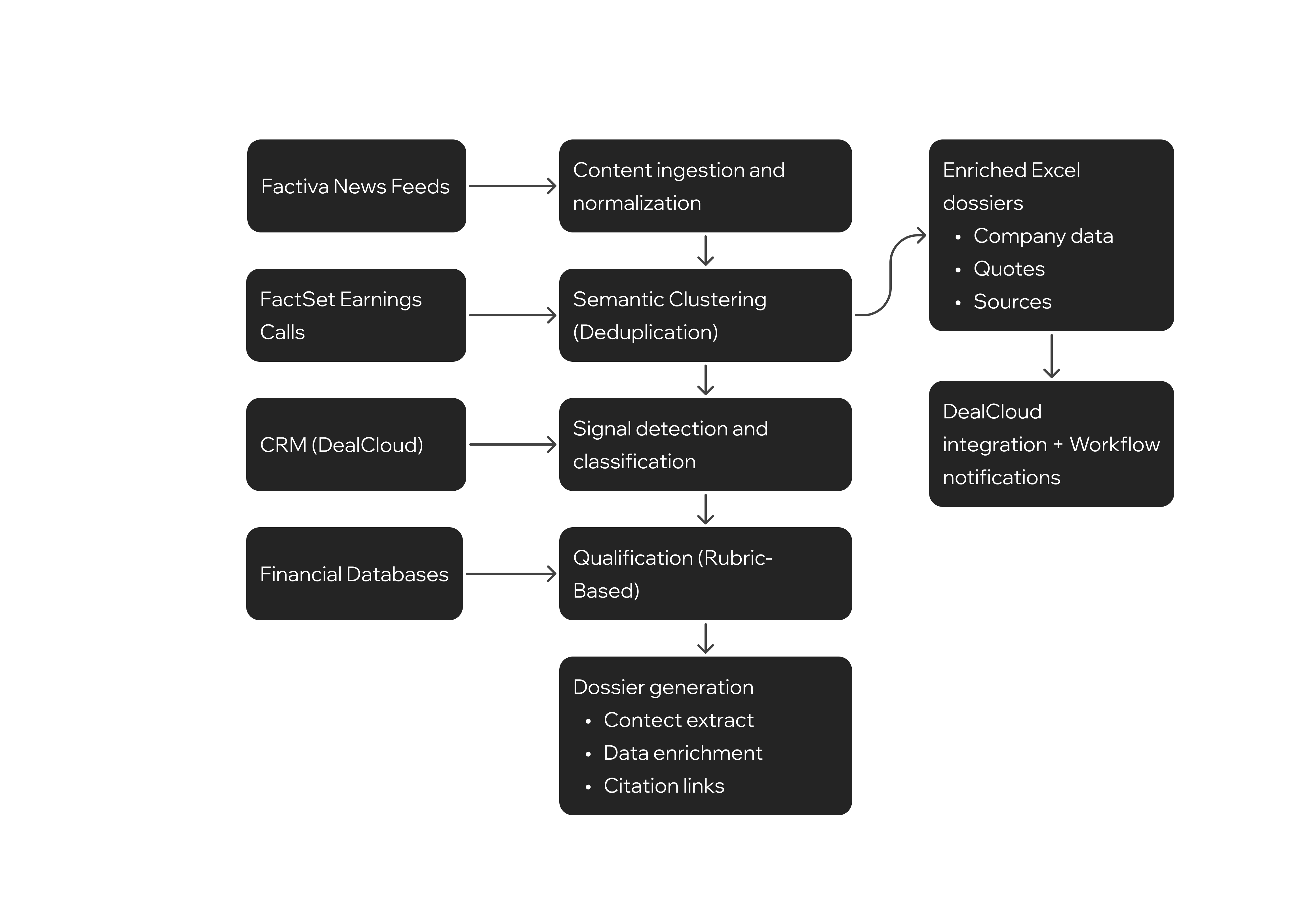 Watches Factiva and FactSet around the clock for divestiture signals. Groups duplicate coverage using semantic clustering (one announcement typically spawns 20+ articles). Filters against the fund's criteria (deal size, geography, sector fit). Packages findings into Excel dossiers with executive quotes, rationale, timeline, and clickable source links. Pulls in financials, ownership data, M&A history from internal and external databases.