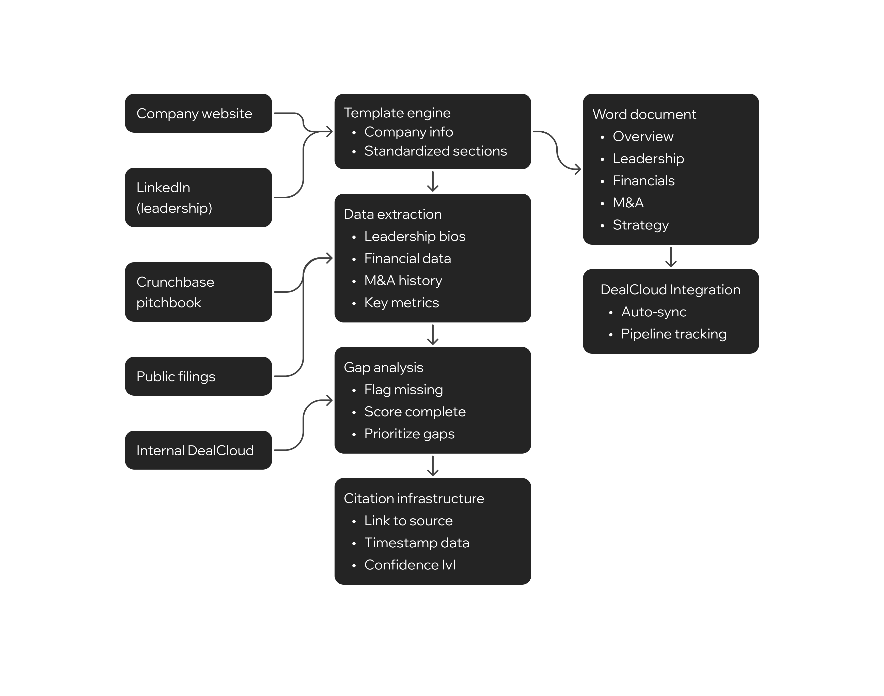 Pulls company data from websites, LinkedIn, Crunchbase, Pitchbook, public filings, internal CRM. Structures everything identically (overview, leadership, financials, M&A history, strategic position). Flags what's missing. Links every fact to its source. Exports to Word in house format. Same structure every time means you can actually compare 50 profiles side-by-side.
