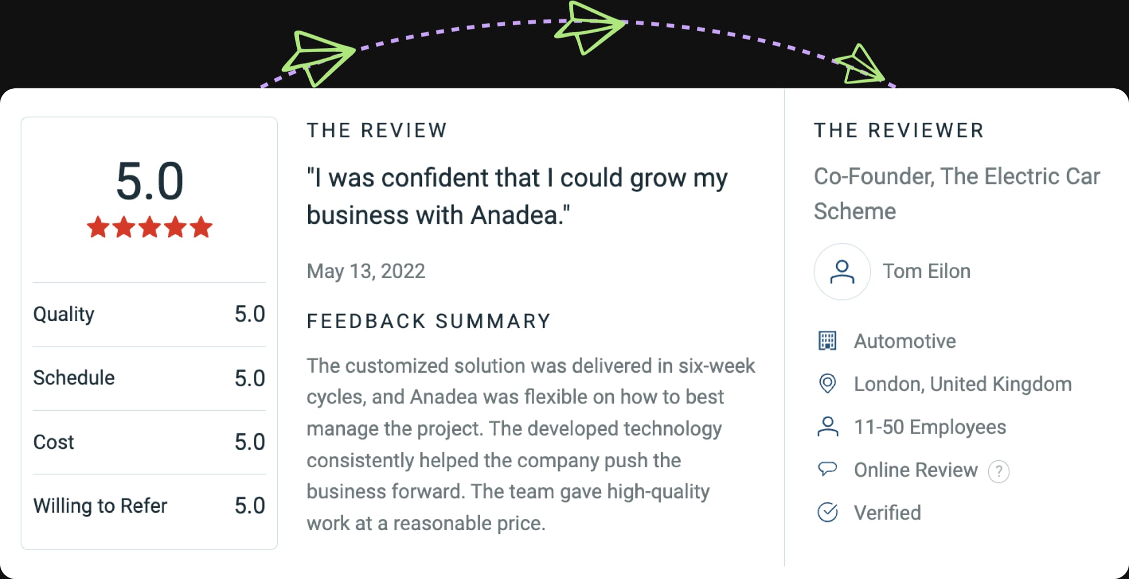 Given the official nature of the electric cars scheme, platforms like the one of our client are in great demand in the UK. This also explains the competition. Although the concept of the ECS isn’t 100% unique, there’s one thing that makes it the first to respond to the emerging needs of the customers: continuous ideation with both the client’s and Anadea's teams. The client recognized our team for effective communication and active collaboration in brainstorming ways to improve the product.