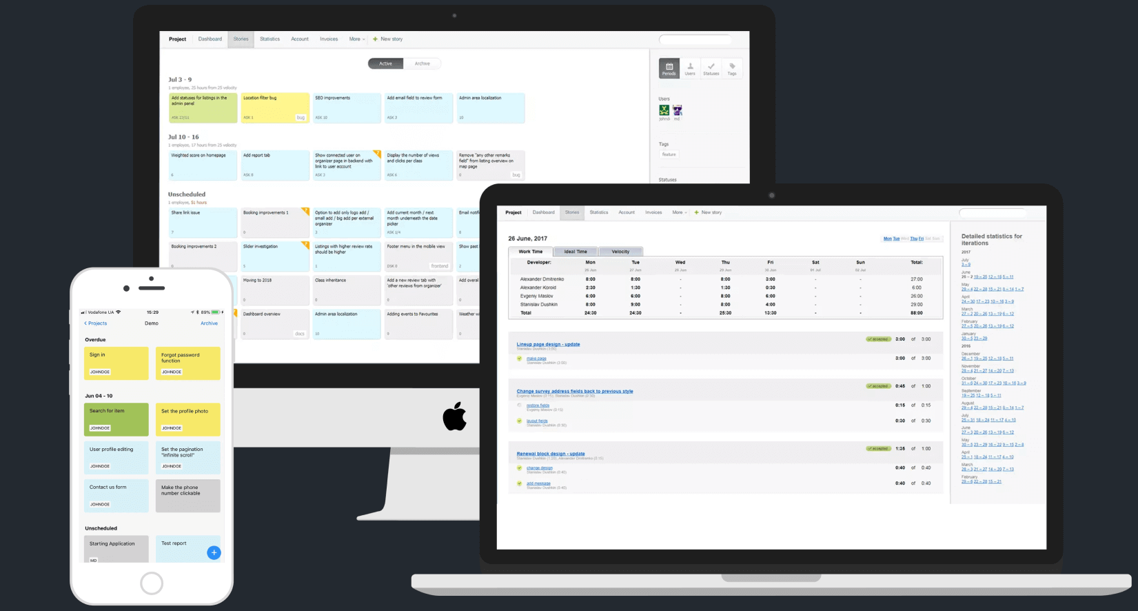 You can easily manage your team online, assign tasks to team members, see who is responsible for each task, and share feedback by editing stories and changing their statuses.