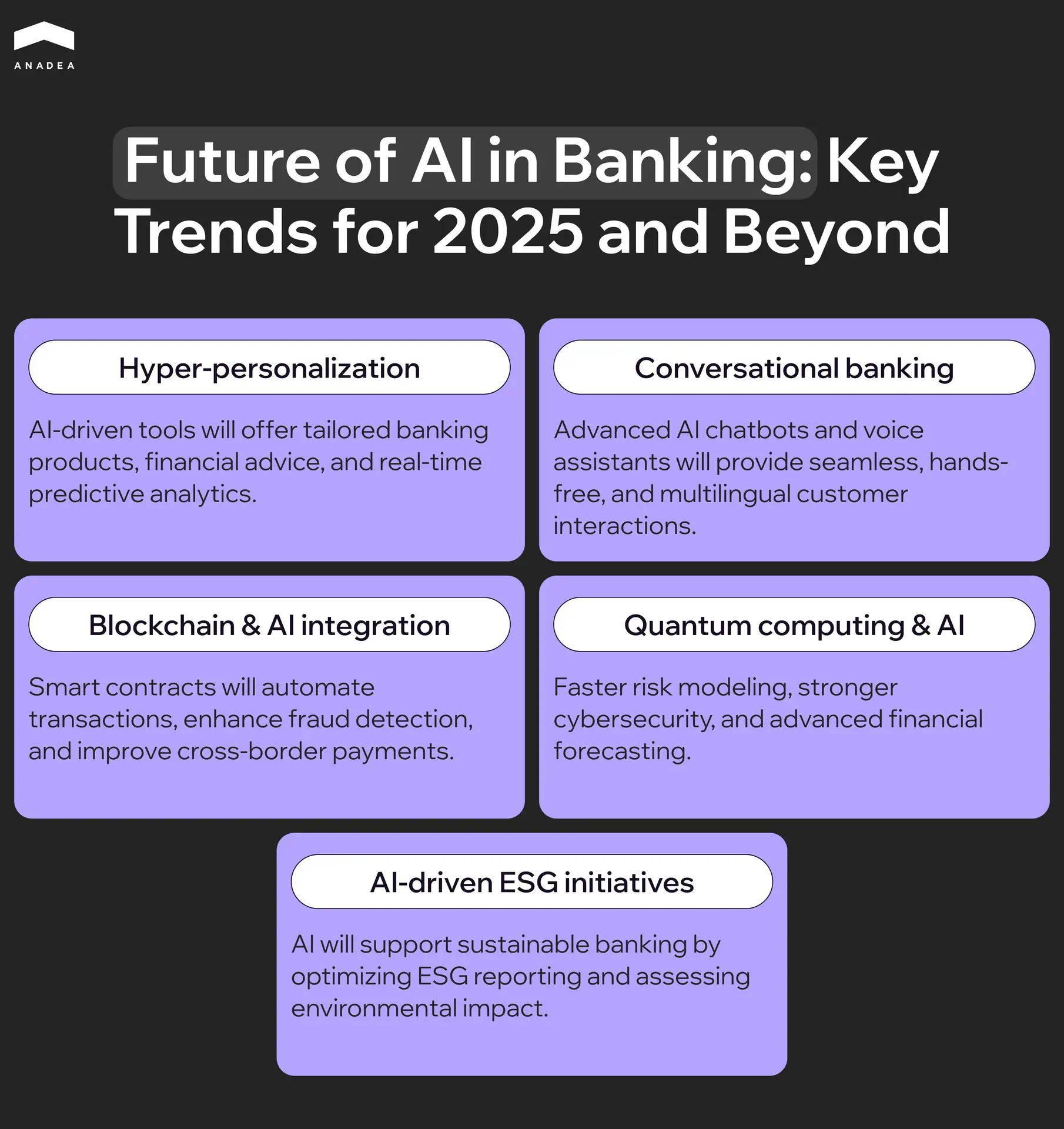 - AI-driven ESG initiatives. It is believed that banking institutions will greatly rely on AI to align with ESG (Environmental, Social, Governance) goals and promote sustainable banking practices. AI-powered analytics tools can process big volumes of data from various sources to assess the environmental impact of investments. This technology will help to develop more efficient approaches to the realization of ESG practices, as well as ensure enhanced reporting and transparency on ESG metrics.