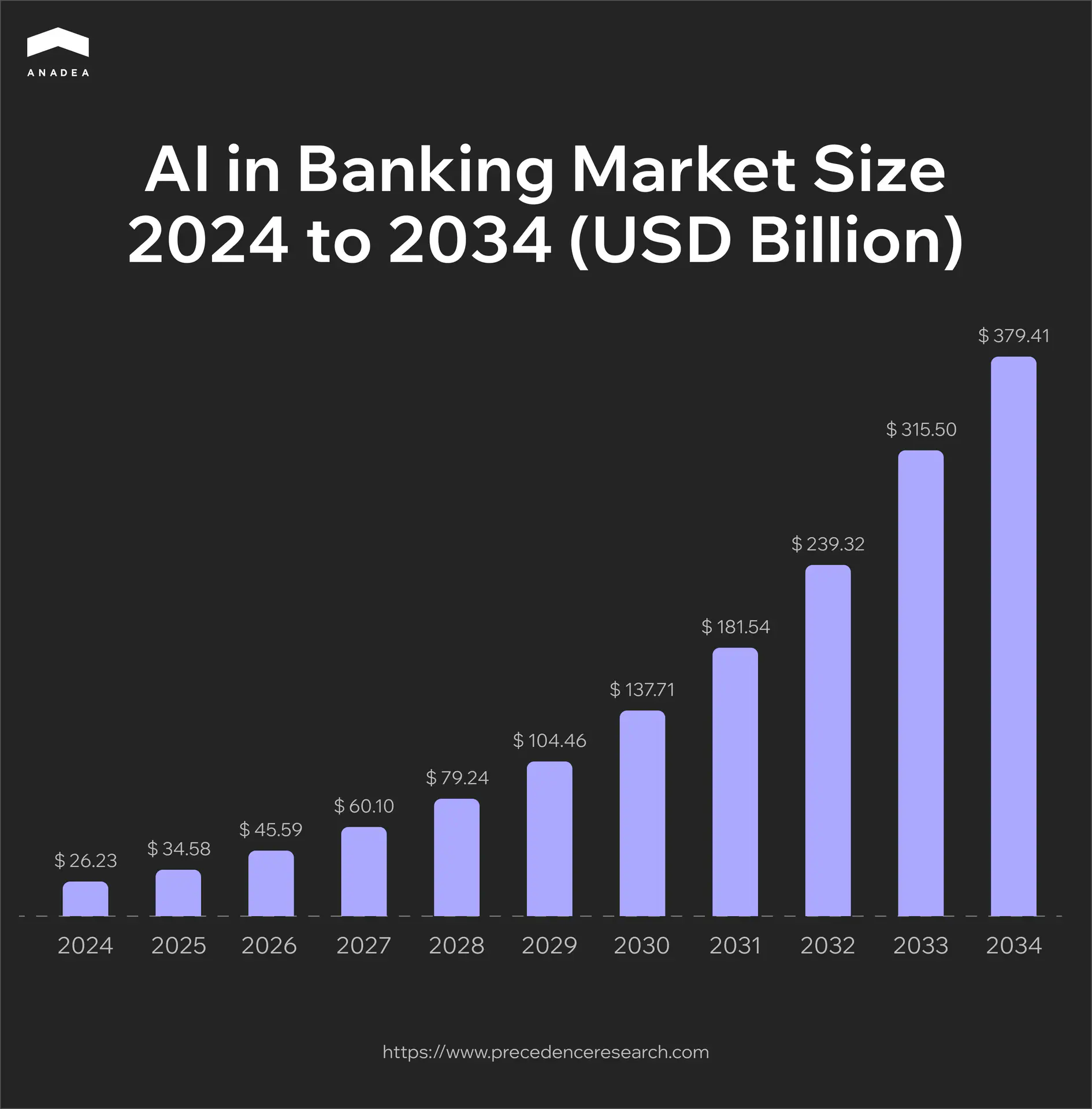 In 2024, the size of the global AI in banking market reached $26.23 billion. In 2025, it is estimated at $34.58 billion. By 2034, it is projected to hit the mark of around $379.41 billion. It means that the market will be expanding with a CAGR of 30.63% within the period from 2025 to 2034.