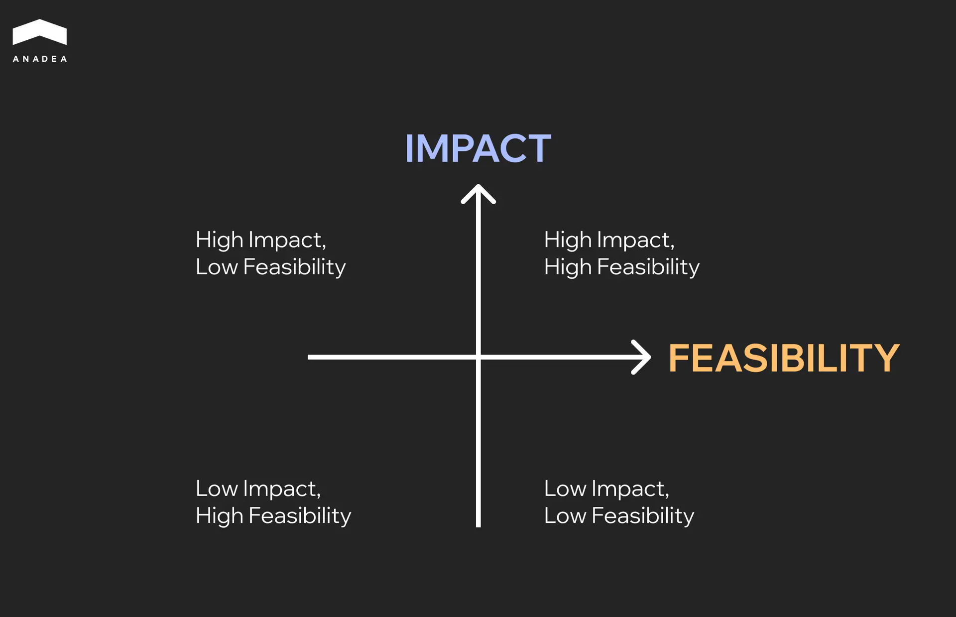 At the very beginning, you should focus your efforts on high-impact, high-feasibility options. These are your quick wins.