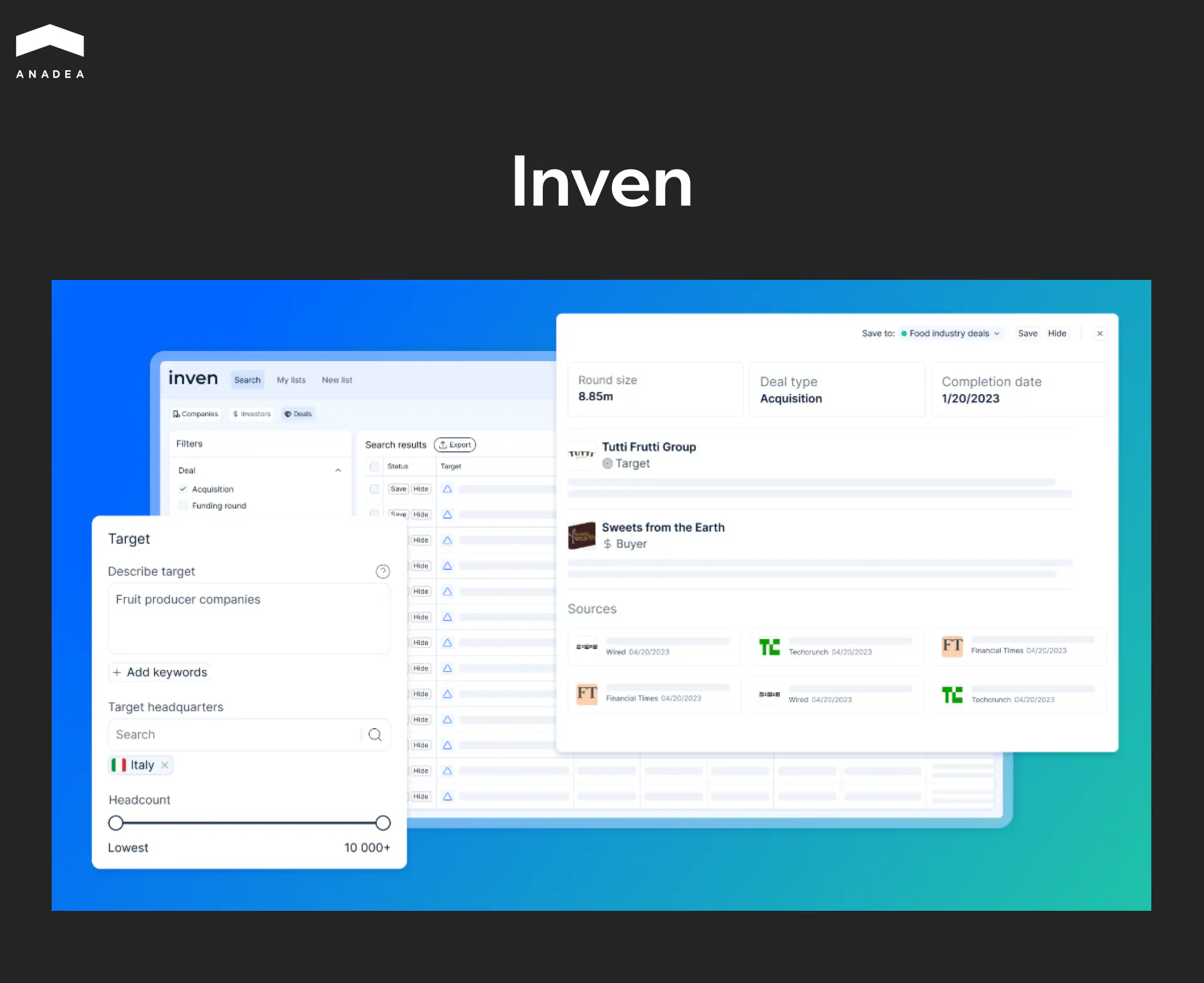 Inven is an AI-native deal sourcing platform founded in 2022 in Helsinki, Finland, by former consultants from McKinsey and BCG. It is designed for private equity firms, investment banks, M&A teams, consultants, and VCs. It helps them analyze and connect with acquisition targets and companies in the private markets.