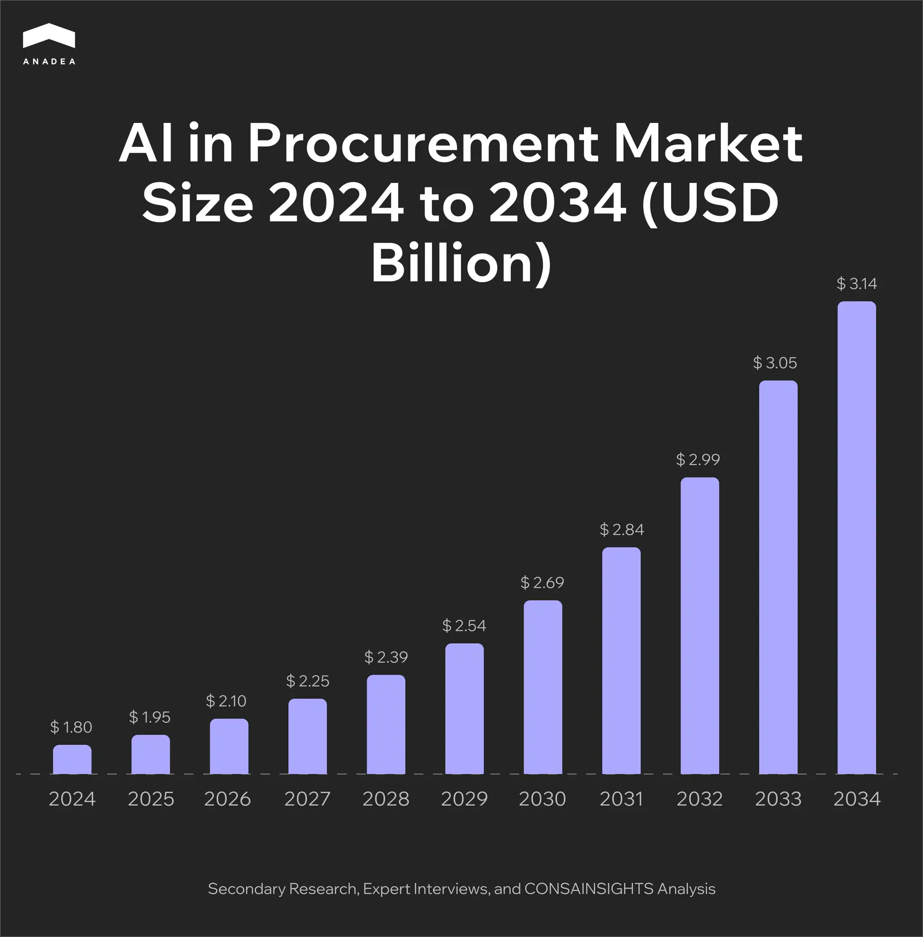 According to the Cons & Insights report, the AI in procurement market size stood at $1.8 billion in 2024. If the positive tendencies in the market growth persist, by 2033, it can hit $3.4 billion.