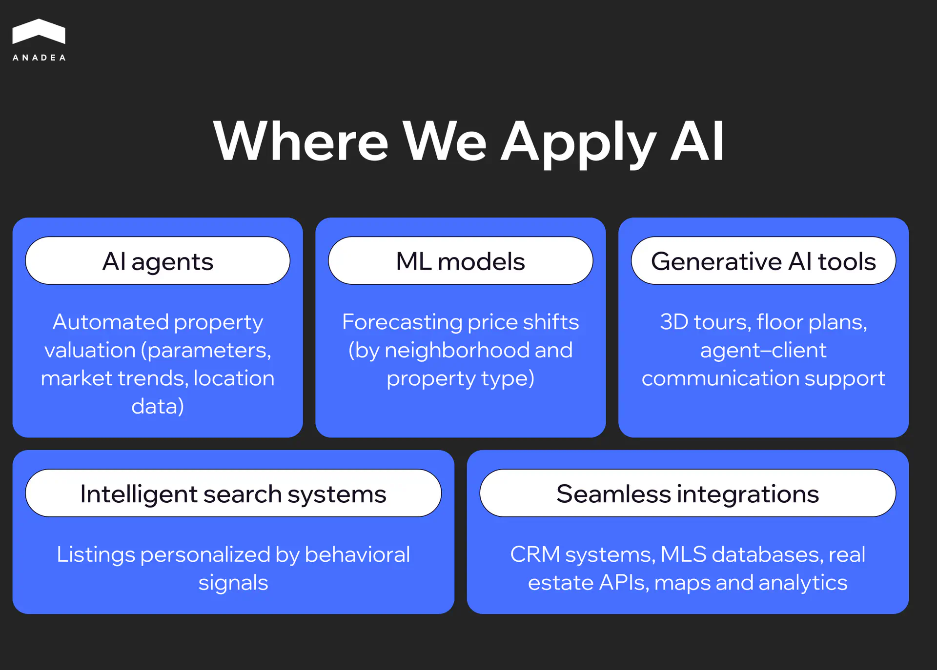 At Anadea, we help teams move from ideas to real implementations. We design the right architecture, embedding AI into sales, property management, analytics, and service workflows.