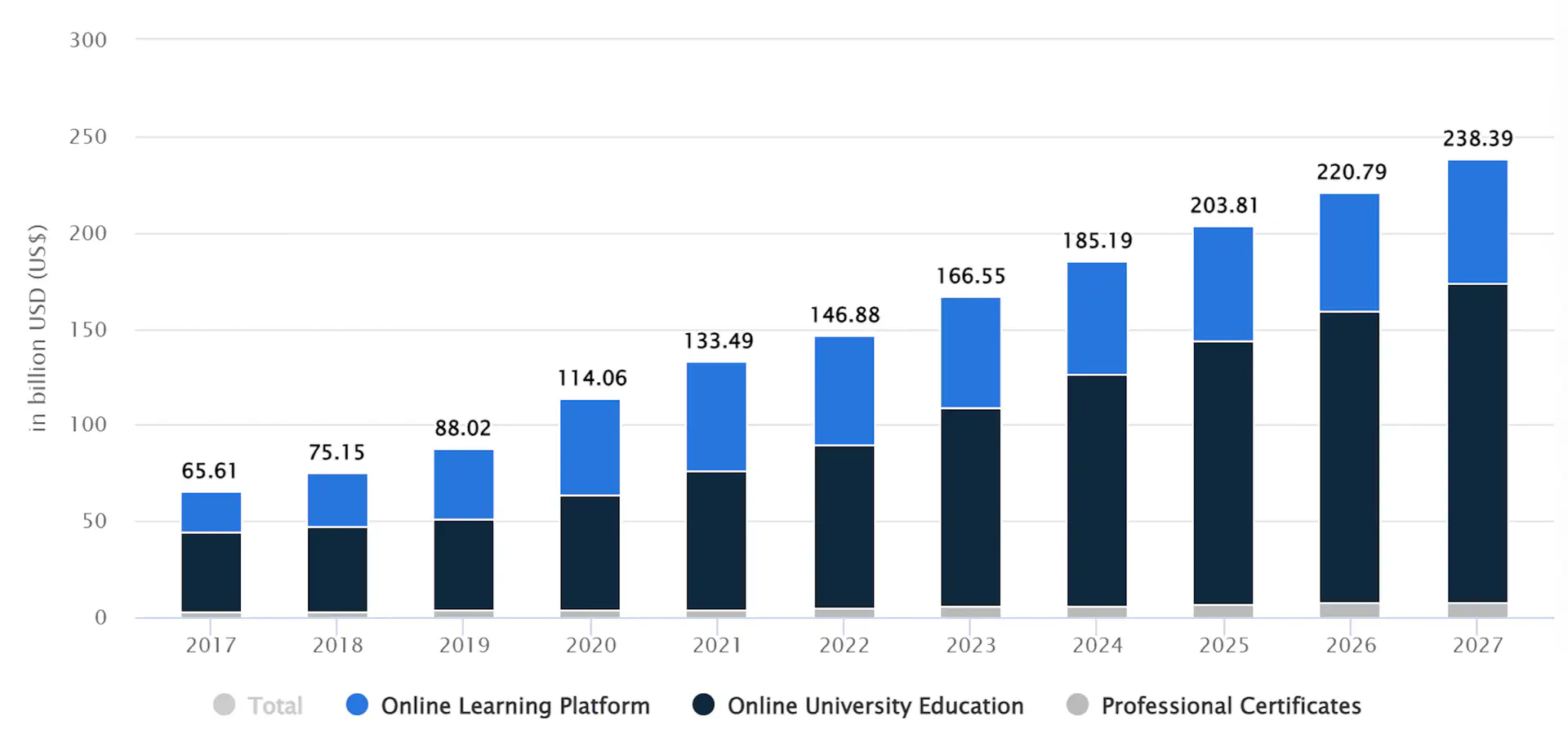 According to experts, the revenue in the online education market will hit the mark of $166.6 billion in 2023. Just compare. For example, in 2017, this figure was at the level of $65.61 billion. And looking at the predictions, we can say that the positive tendencies are here to stay. It is projected that the market volume will be around $238 billion by 2027 which shows that the CAGR within the period from 2023 to 2027 will be over 9%.