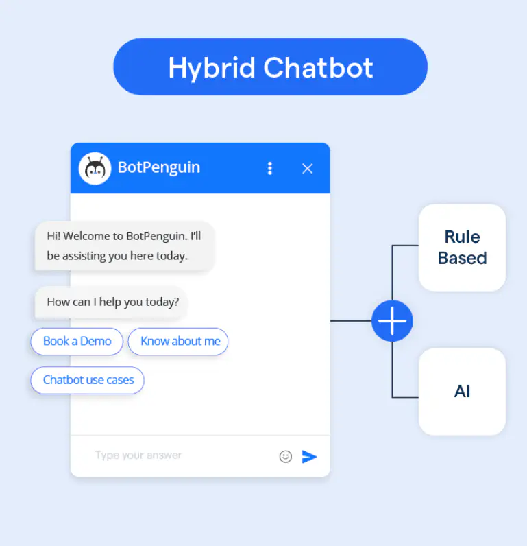 As it is possible to understand from the name of this category, such solutions combine features of several chatbots types. AI chatbots are a very promising option but not all companies have enough data and resources to train and further support them. That’s why they can opt for hybrid solutions that unite the simplicity of rule-based solutions and the capabilities of AI.