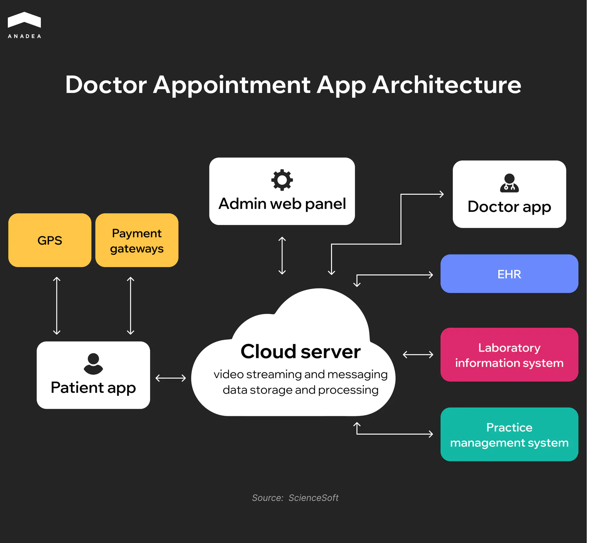 In the infographic below, you see the basic architecture of a typical doctor appointment booking app: everything from mobile applications and payment gateways to cloud storage, EHR systems, and laboratory databases.