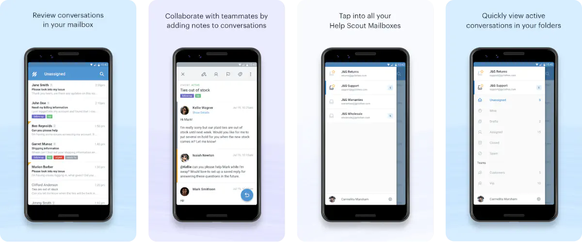 Help Scout is a solution that allows companies to provide support services to their customers at any time. This app helps to quickly reply to clients, view conversations, and assign them to other employees.