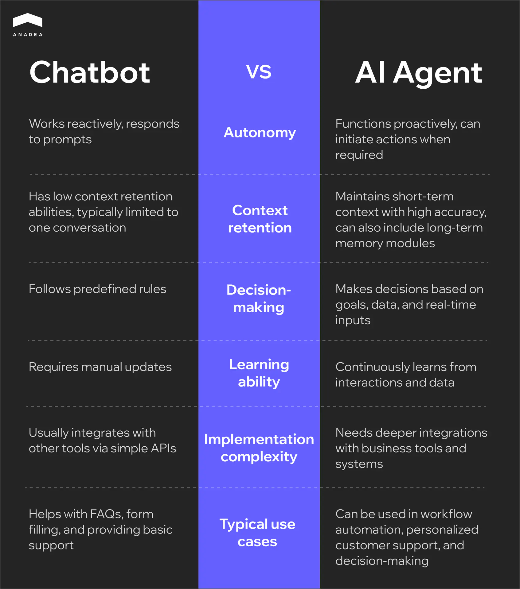 Nevertheless, when it comes to more complex processes, their capabilities are not enough. And that’s when more advanced AI agents enter the game. These autonomous and semi-autonomous solutions can act as proactive assistants and deal with dynamic tasks and multi-turn conversations.