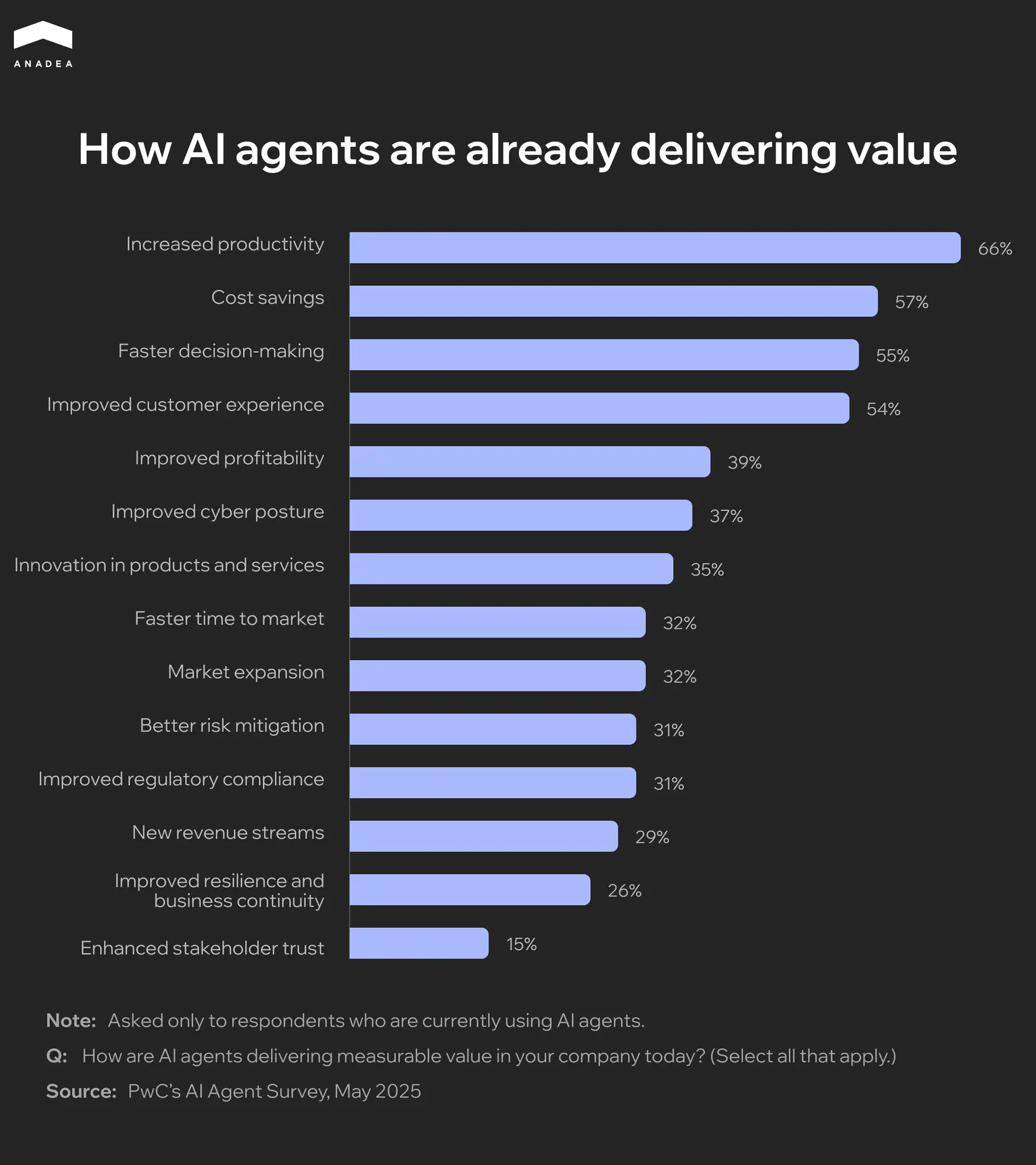 The data that comes from PwC’s survey shows that 66% of respondents cited increased productivity as the main advantage of using AI agents. Cost savings (57%), faster decision-making (55%), and improved customer experience (54%) are among other commonly mentioned benefits.