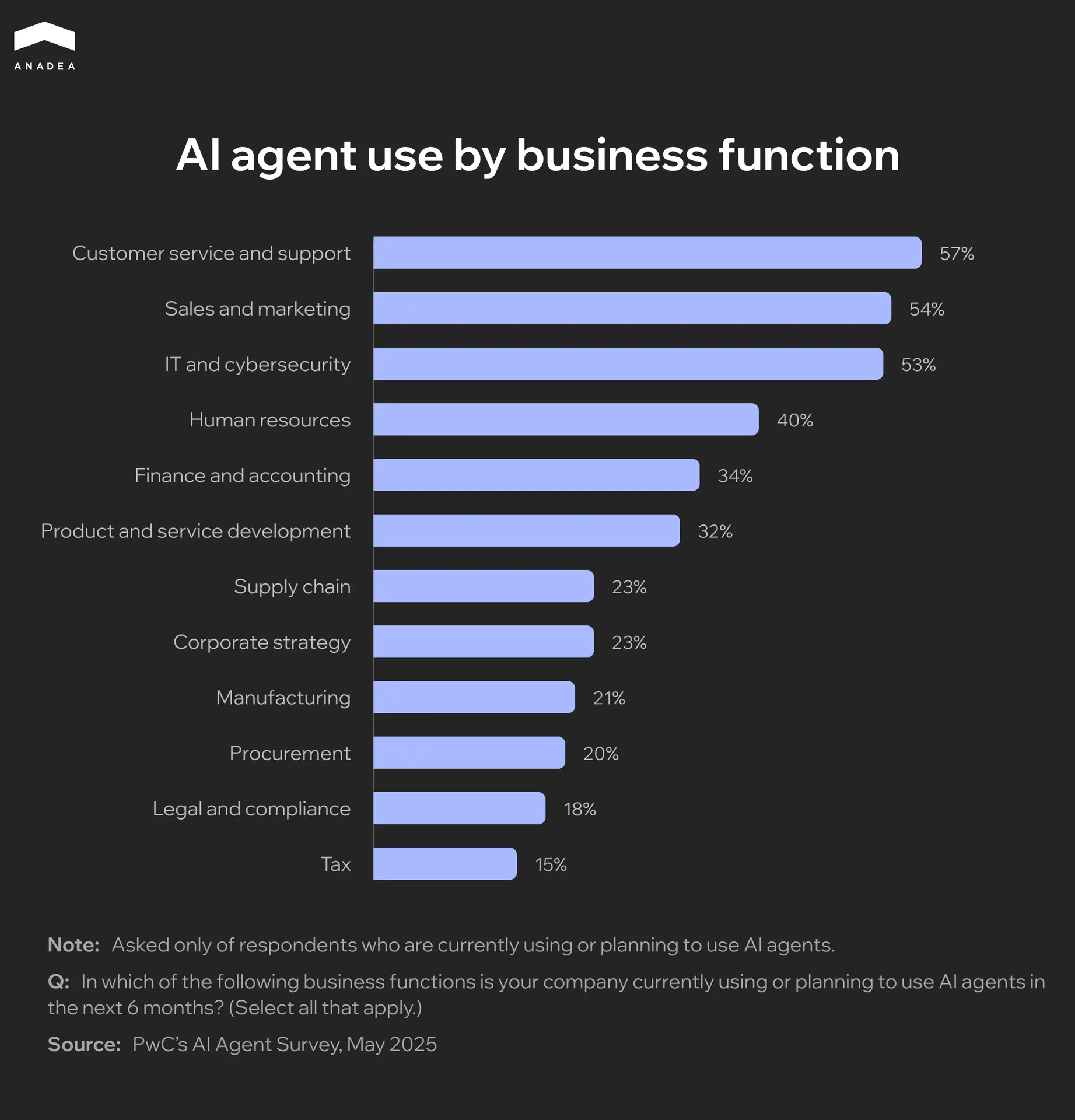 Already today, AI agents have found their use across industries. According to PwC’s AI Agent Survey, as of May 2025, 57% of companies have already implemented AI agents for customer support or are planning to do so within the next six months. Sales and marketing are the second most common applications of such solutions, while IT and cybersecurity are in third place.