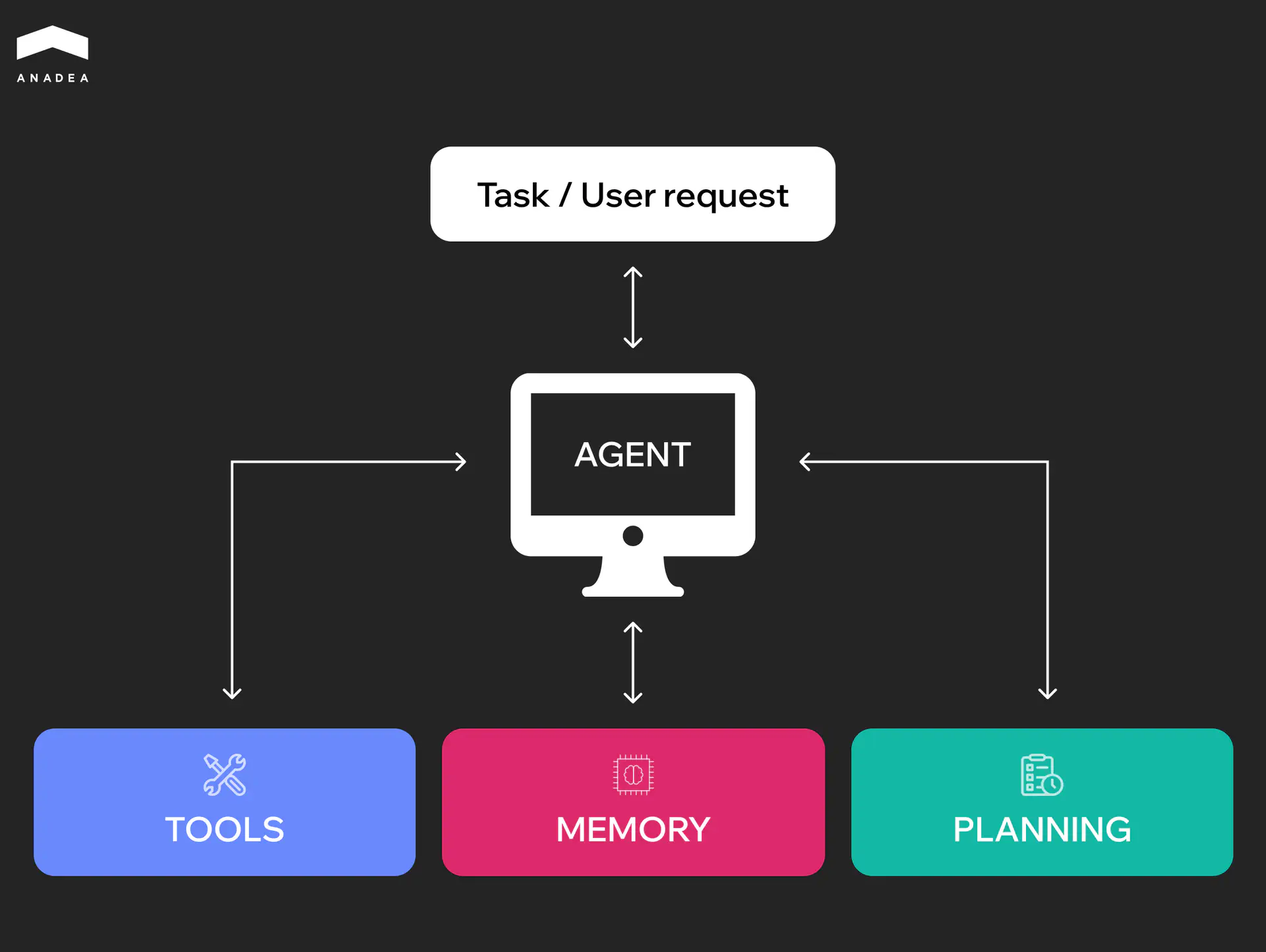 Before we proceed to our practical tips on how to build AI software, let’s take a closer look at the structure of an AI agent. Thanks to this, you will get a better understanding of how such solutions work.