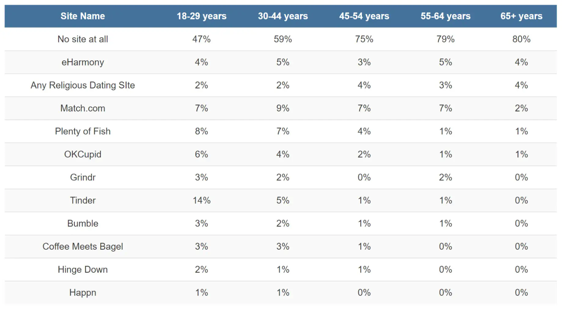 Younger adults of 18-29 y.o. who are the most active users of dating services prefer Tinder which is quite an obvious choice. At the same time, representatives of other age groups turn to Match.com more often.