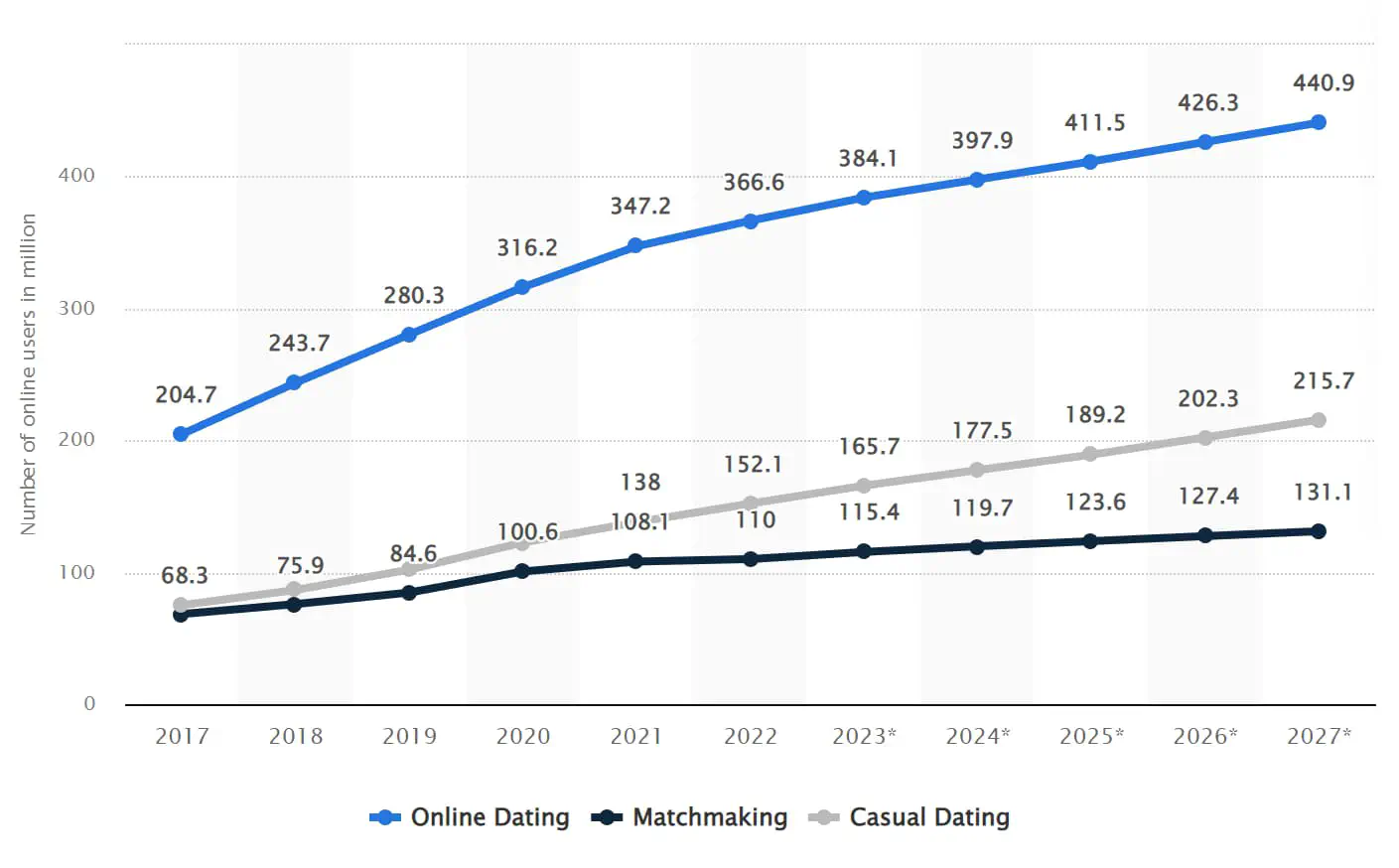 The popularity of dating apps is continuously growing. And at the moment, there are no factors that can indicate that this tendency will change. There were about 366 million users of online dating services in 2022. And according to experts, this figure will hit the mark of 440 million in 2027.