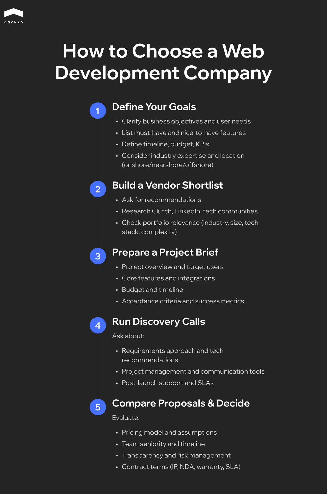 The answers to these questions will help you understand what kind of partner best fits your needs. For instance, if you just need to refresh the UI on your existing website, you can cooperate with a web design studio. However, for complex products, unique frontend solutions, or custom backend systems, you will need to hire a web development agency. In this case, your partner should be able to cover all the steps of the project delivery, from strategic planning to maintenance.