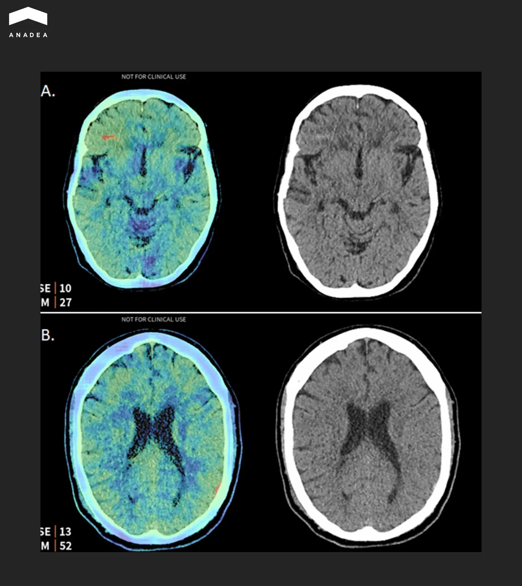 The image below shows an example of such a system in action. The Aidoc algorithm analyzed a brain CT study and detected two hemorrhages that were missed during the initial reading by the radiologist. The left side of each pair shows a saliency map indicating the areas where the algorithm focused its attention. The right side shows the original CT slice.