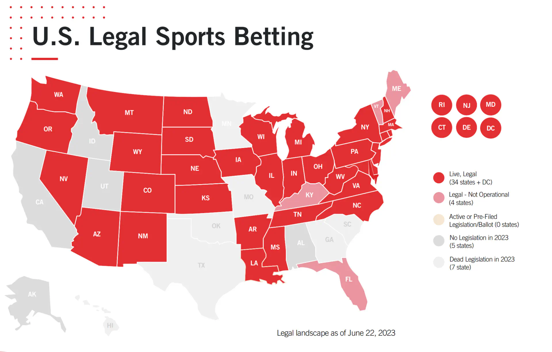In the United States, the situation is also quite interesting. If you are going to launch a betting application in the US, we recommend you carefully study the market situation at the ongoing moment as the situation can be dynamic. As of June 2023, 34 states and the District of Columbia have a “Live, Legal” status. It means that sports betting services can be offered via legal sportsbooks. There are also 4 states where sports betting is legalized but the market here is not available.