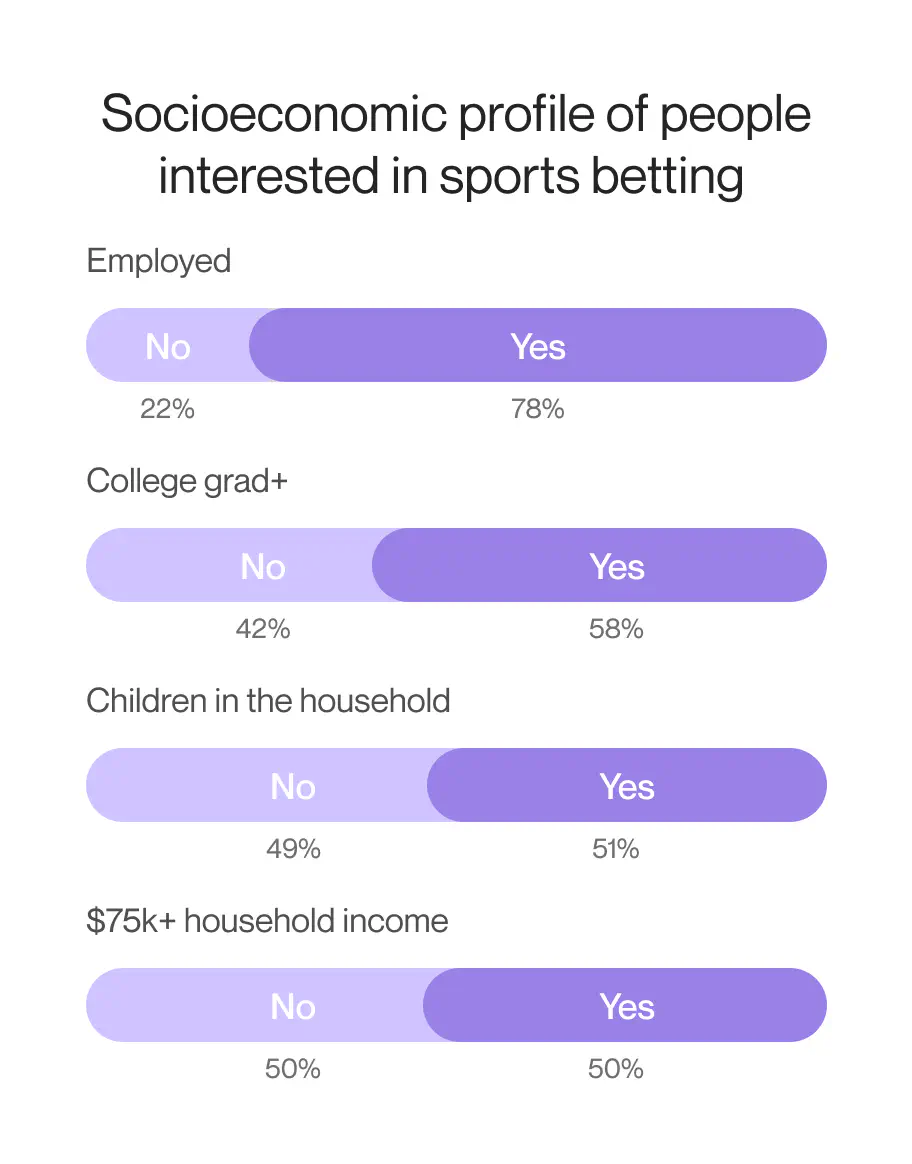 In general, the research has helped to create a socioeconomic profile of an average participant in sports betting activities. Despite the stereotypes that may say that unemployed millennials are the most active users of such apps, in reality, they are usually adults with kids and full-time jobs.