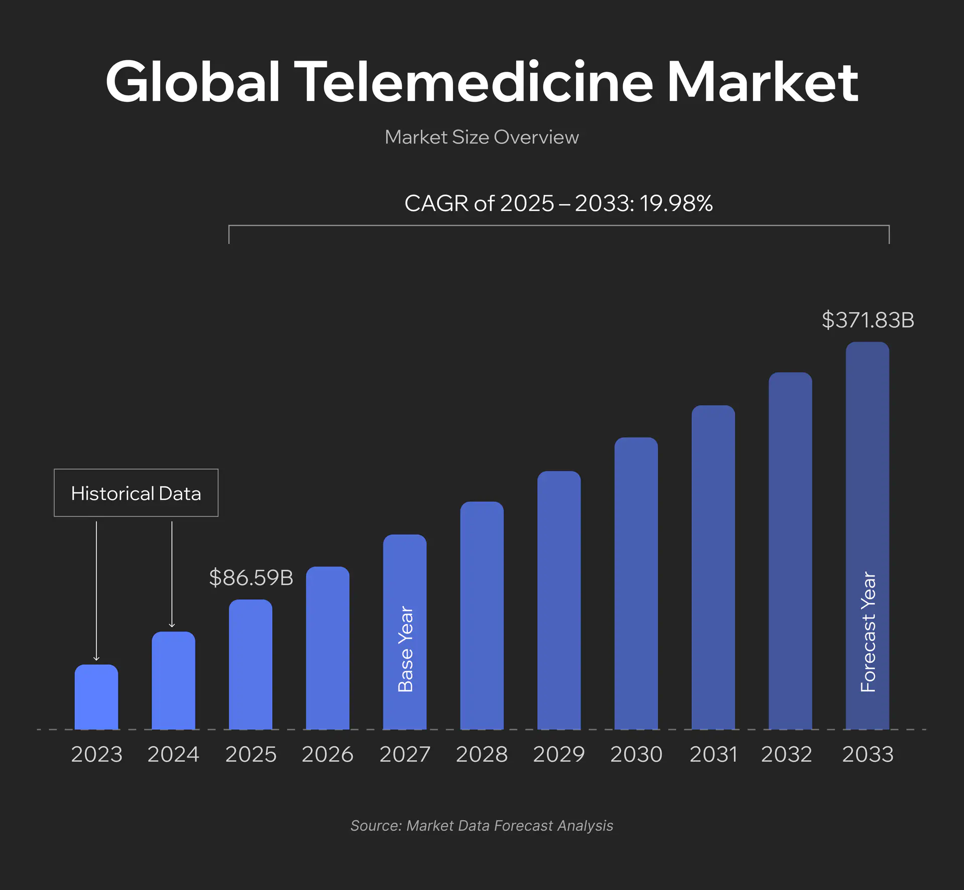 The COVID-19 pandemic catalyzed mass adoption of digital solutions in the healthcare industry. The Centers for Disease Control and Prevention recorded a 154% increase in telehealth visits during the last week of March 2020 compared to the same period in 2019. Today, the global telemedicine market is forecast to grow from $72.17 billion in 2024 to $371.83 billion by 2033 at a CAGR of 19.98%.