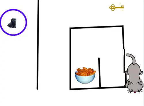 My son’s project was short games like this one. A little puppy needs to bypass obstacles and get the key to open a square room to eat some snacks. It needs not to stumble upon a cat that walks up and down the playing field. The puppy’s movement is controlled by the arrows on the keyboard. By the way, it’s not that easy to win. =)