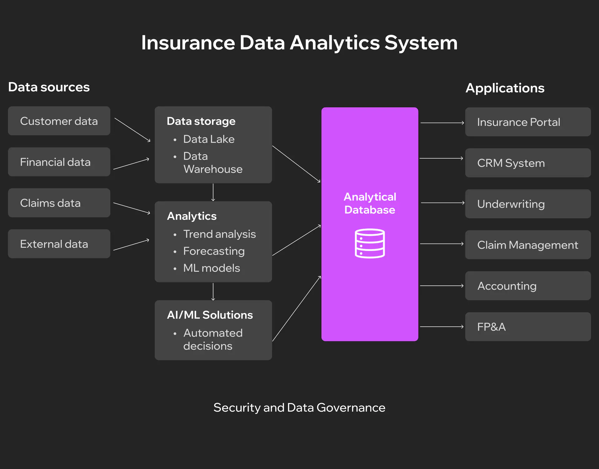 - Data analysis layer is the system’s core. Here, algorithms perform retrospective analysis (what caused last quarter’s losses?), trend analysis (how is customer behavior changing?), root cause analysis (why did claims increase in a specific region?), scenario modeling, and forecasting.